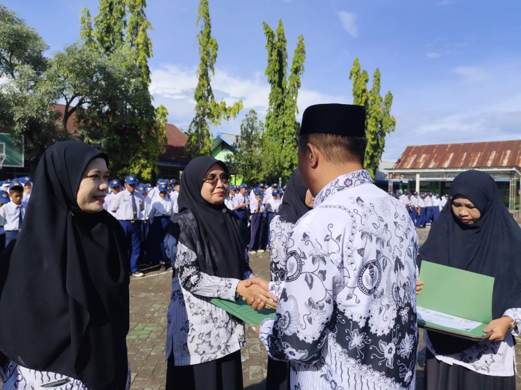 Selain itu, Kepala Sekolah juga menyerahkan Piagam penghargaan kepada guru dan staff tata usaha sebagai lambang penghargaan dedikasi dan pengabdian di SMP Negeri 3 Sungguminsa.